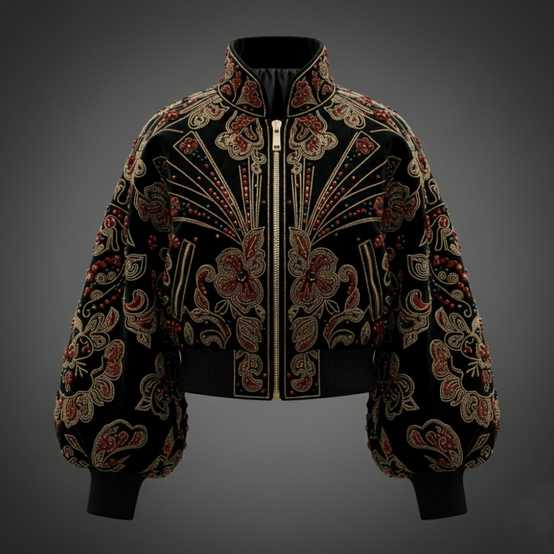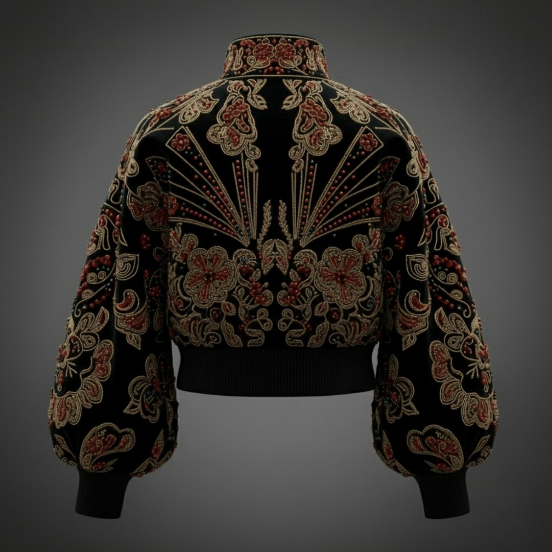 high-fashion velvet bomber jacket showcasing symmetrical, heavy-thread floral embroidery in deep red and gold tones. The garment features dramatic balloon sleeves and a structured high collar, both adorned with matching needlework and bead-like accents. A sleek gold-tone zipper runs down the center, contrasted by classic ribbed knit cuffs and a ribbed waistband for a modern silhouette.