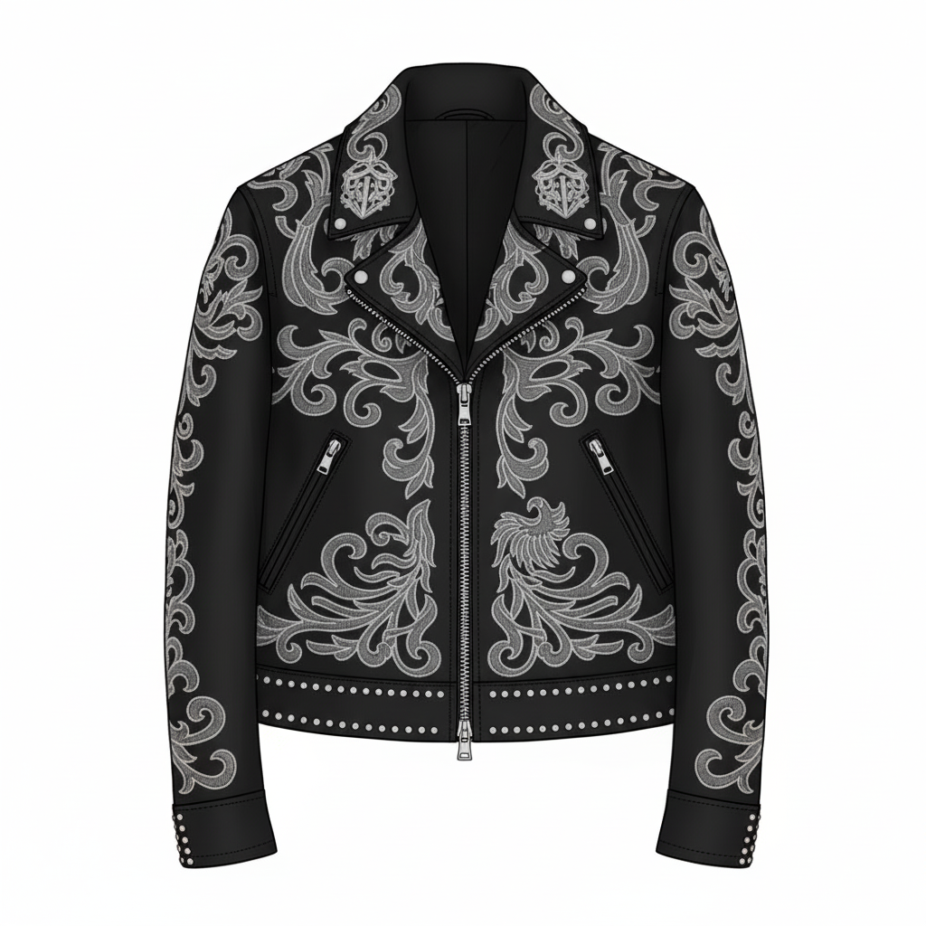 Black Leather Biker Jacket with Silver Baroque Embroidery