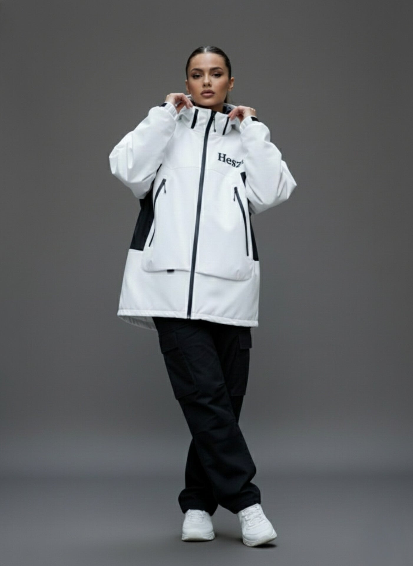 Colorway: Crisp white primary body with contrasting black accents on the chest and zippers.