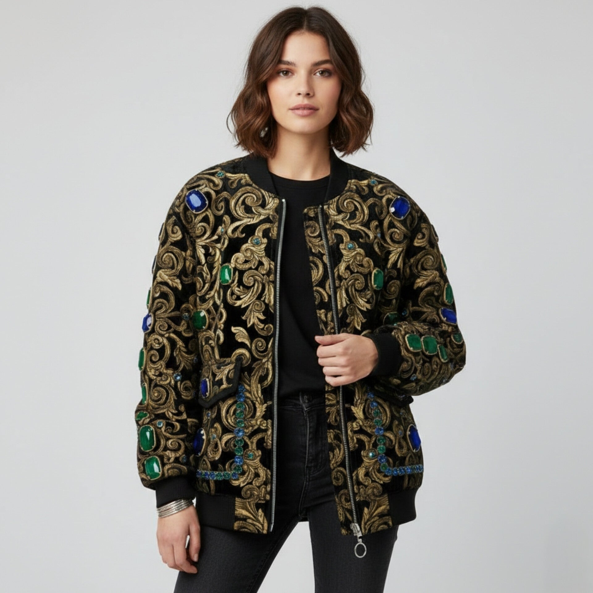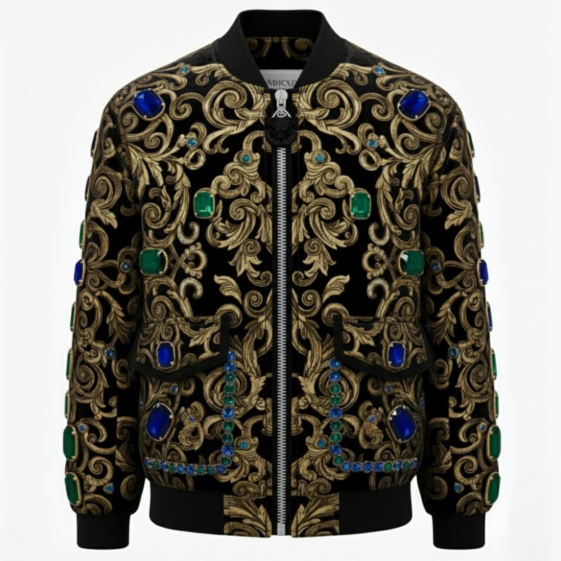 luxurious bomber jacket is a true statement piece, featuring a rich, ornate baroque pattern in metallic gold thread against a plush black velvet base. The design is heavily inspired by classical European royalty and opulence.