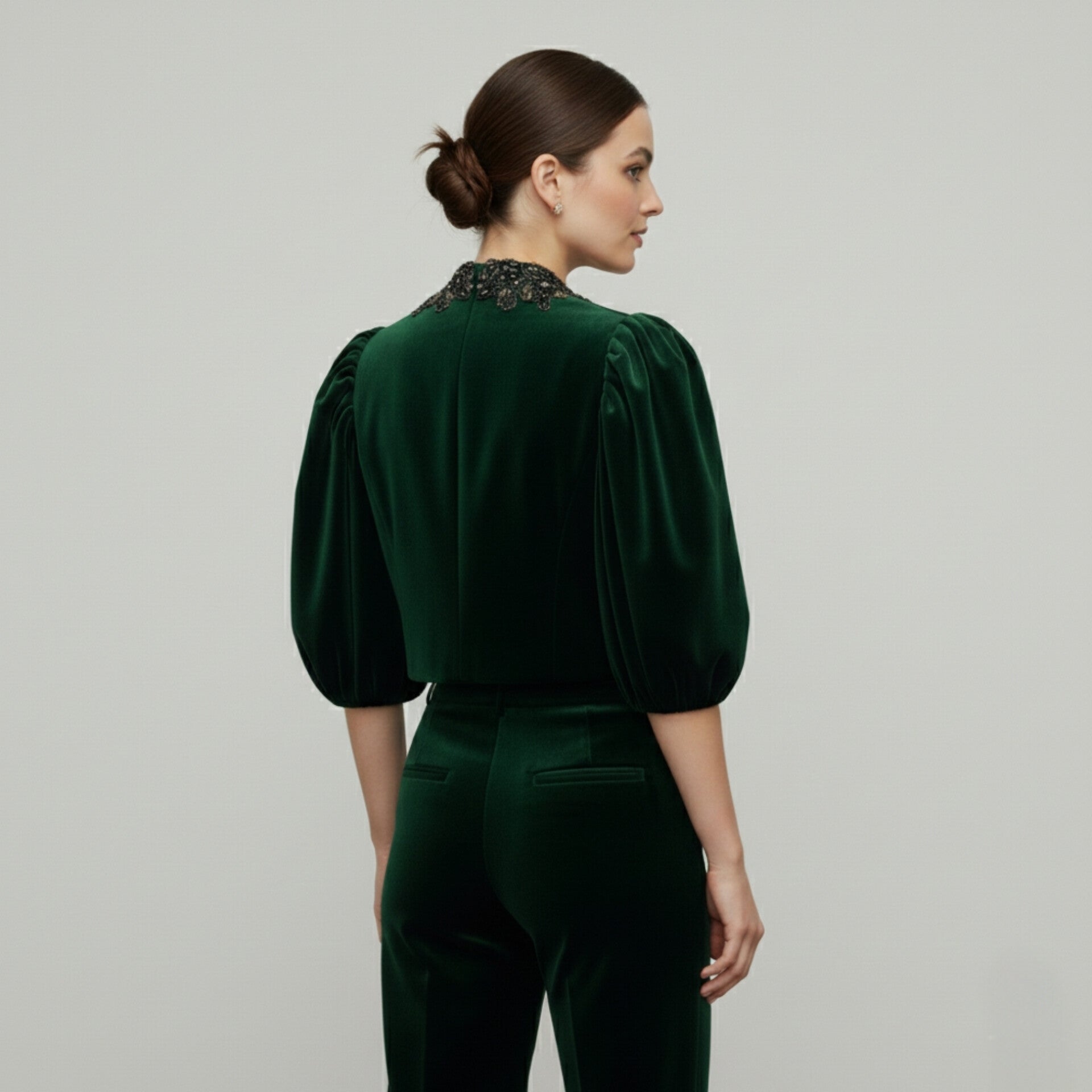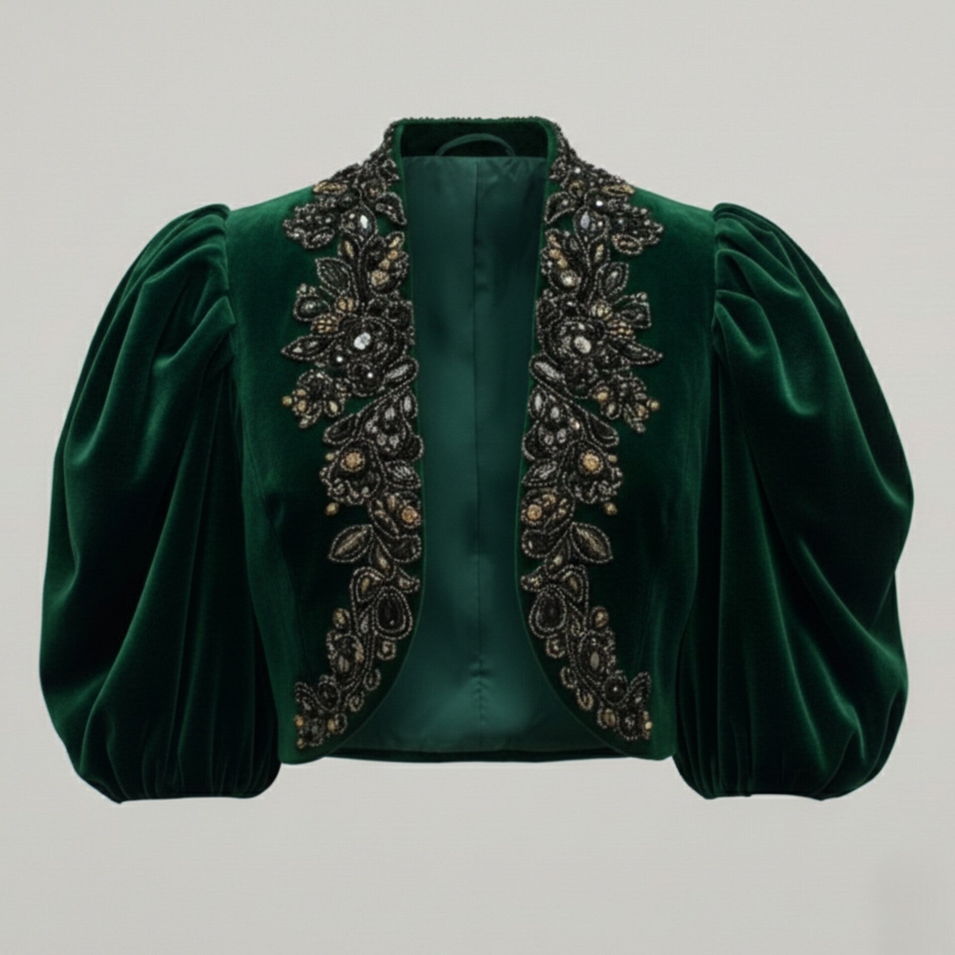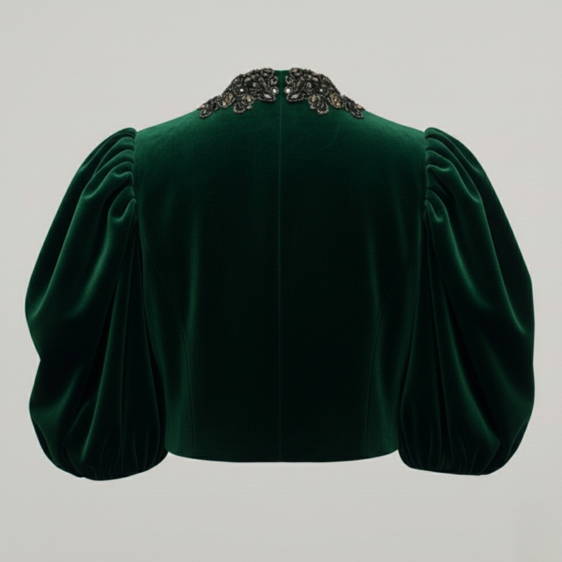 Luxurious, rich emerald green velvet. Its standout feature is the dramatic, voluminous puff sleeves that cinch at the elbow, adding a touch of vintage glamour.
