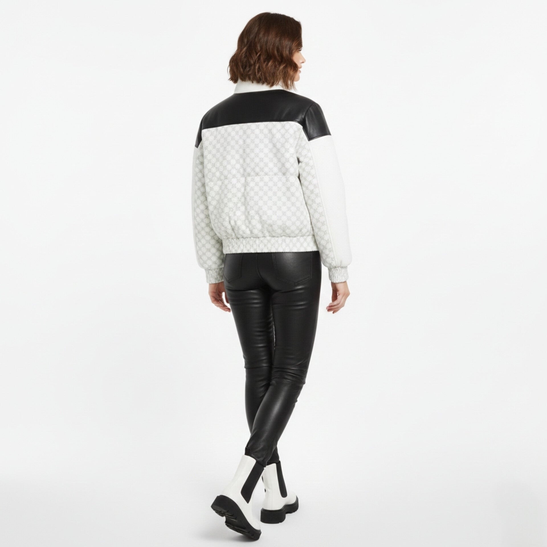 Material and Texture: The main body and sleeves are made of a quilted, padded fabric featuring a subtle, repeating monogram pattern .The shoulders/yoke section is crafted from solid black leather or faux leather, creating a strong contrast.