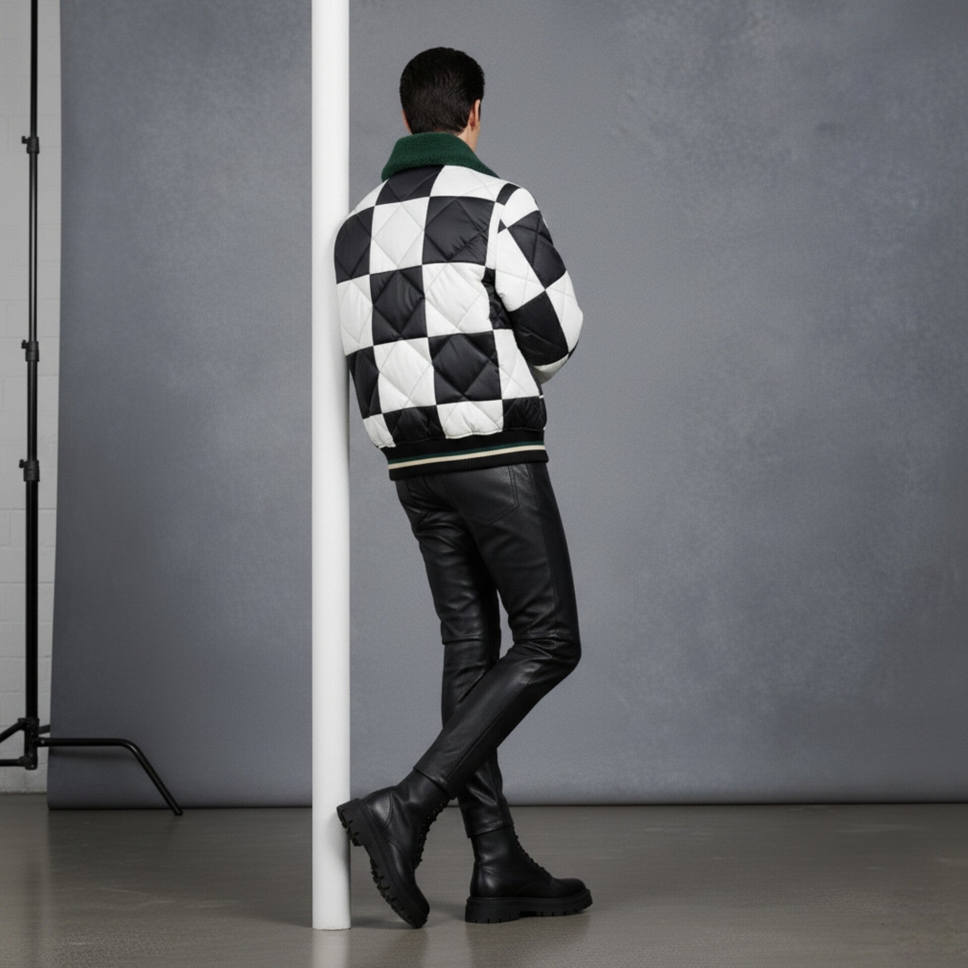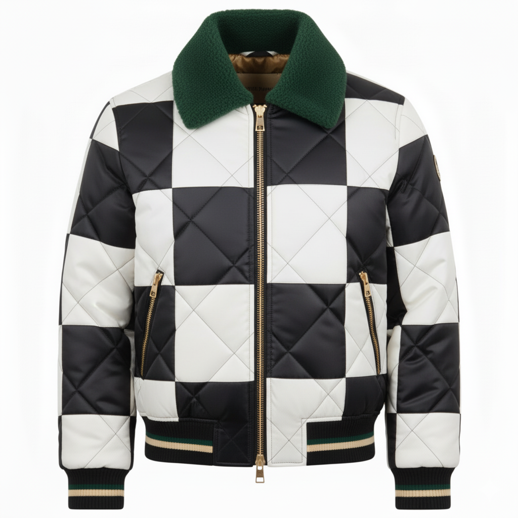 This piece blends a classic racing or mod-inspired checkerboard aesthetic with the warmth and comfort of a modern quilted bomber.