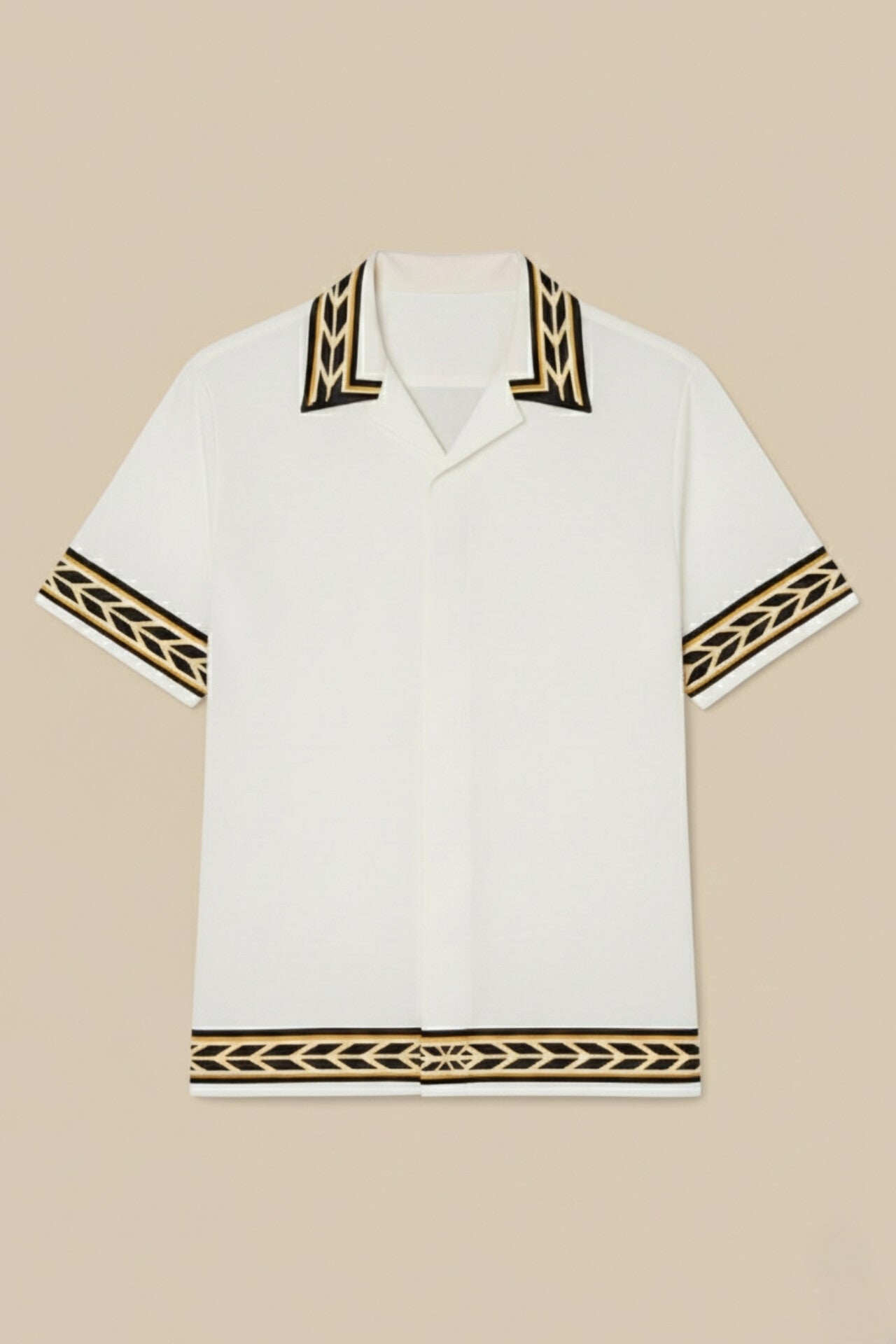 The design combines the relaxed silhouette of a resort shirt with highly detailed, almost Art Deco or ethnic-inspired patterning, making it a distinctive and eye-catching piece perfect for summer events, holidays, or stylish casual wear.