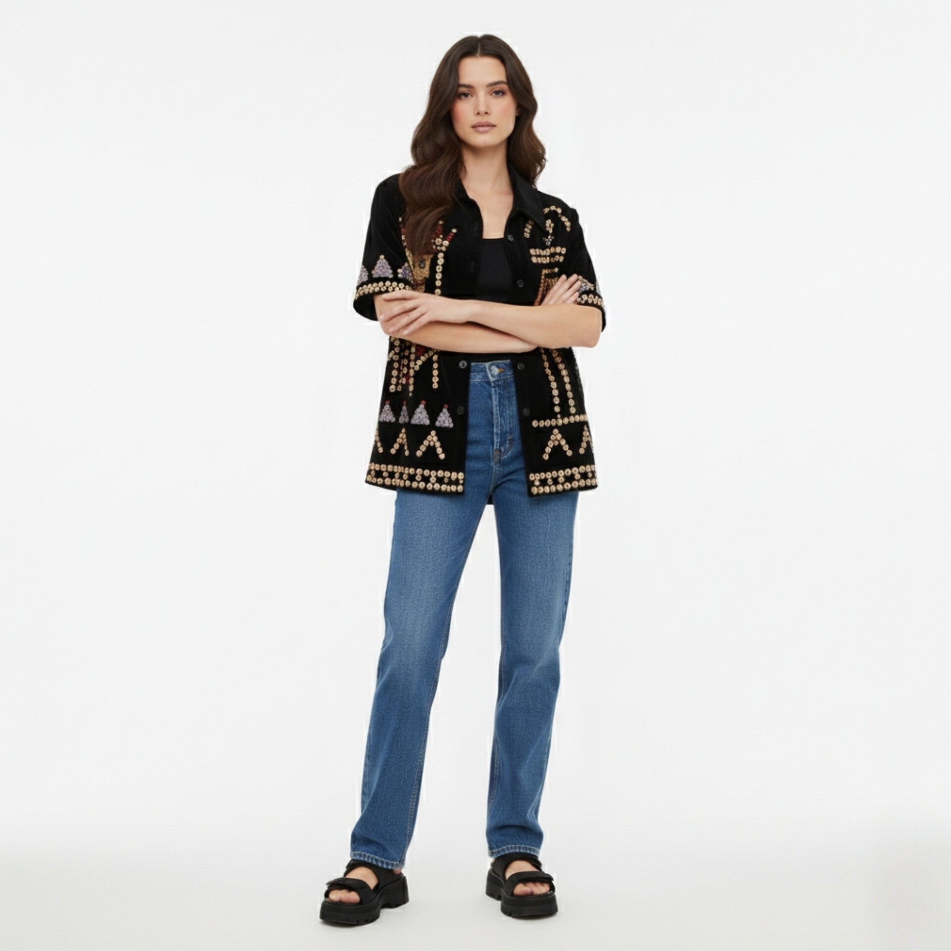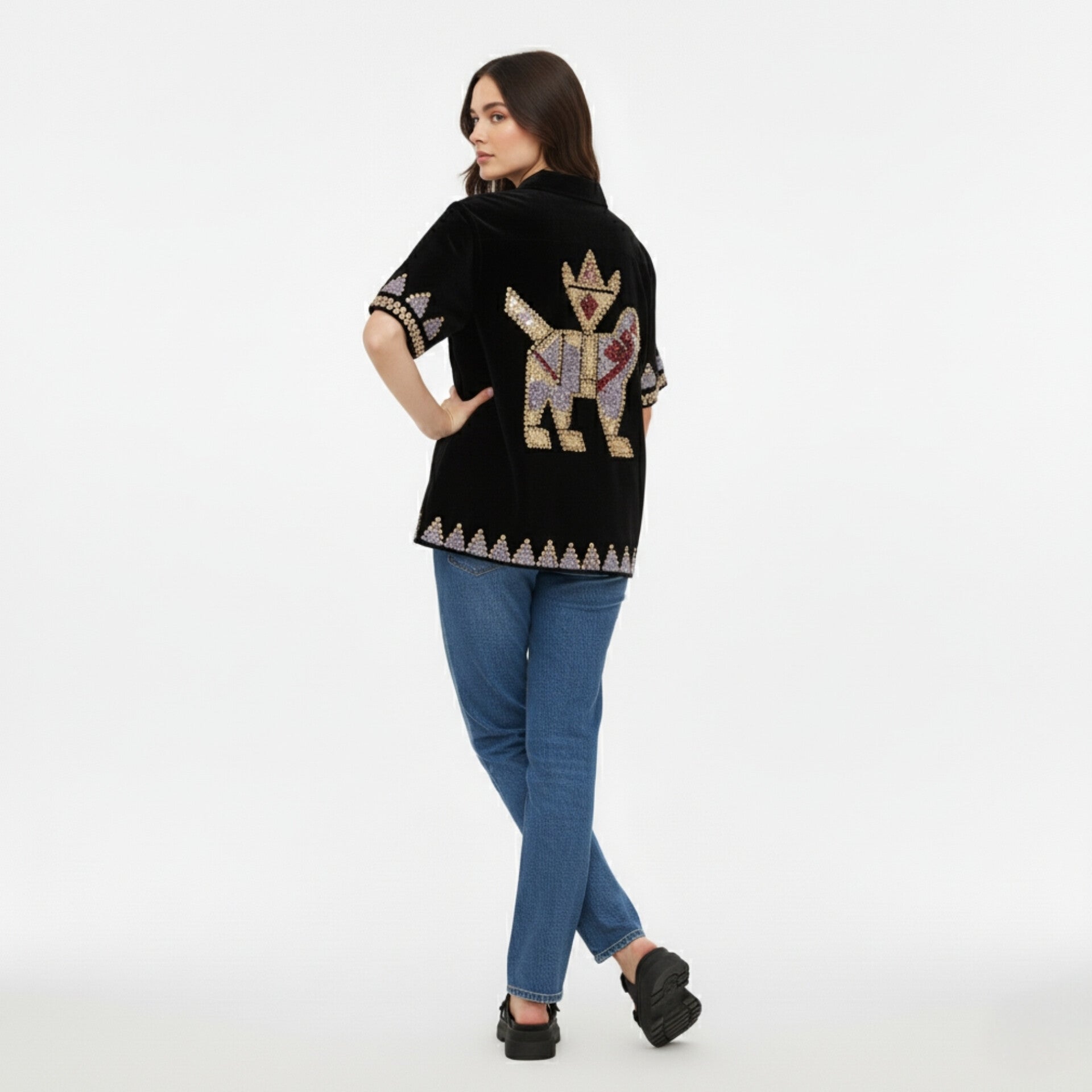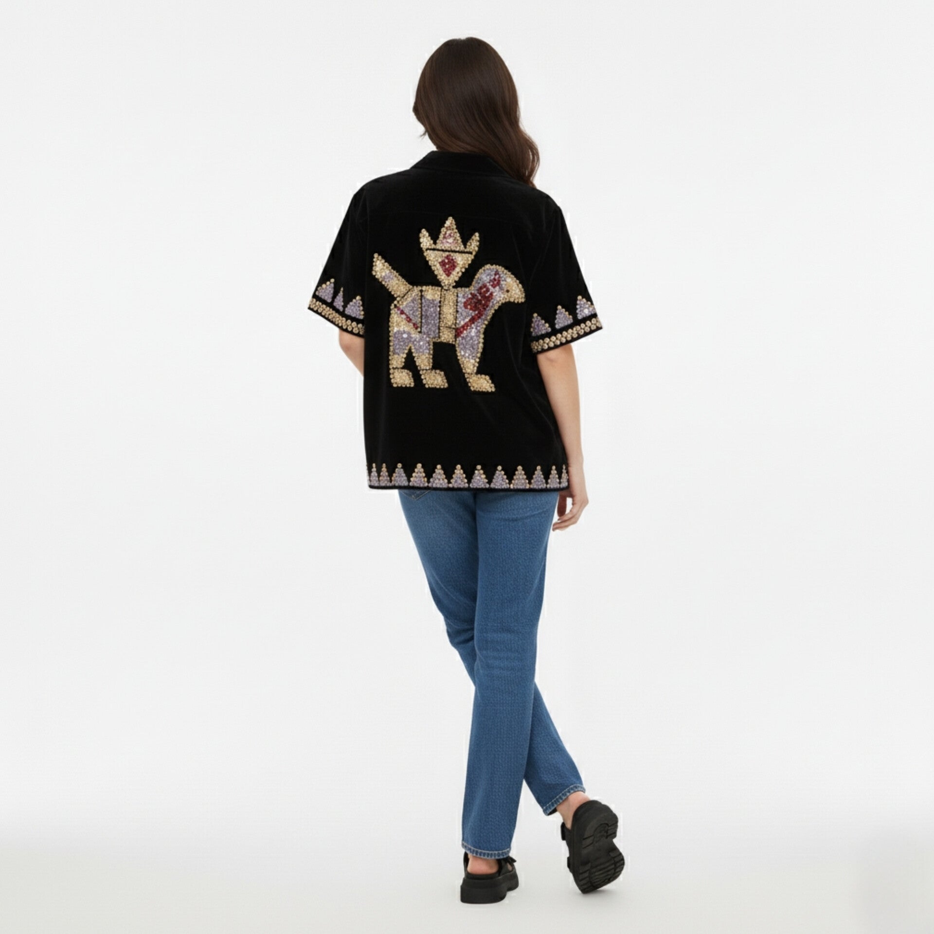 Black velvet short-sleeve button-down shirt heavily embellished with sequins. The most striking feature is the large, colorful sequin motif dominating the front, depicting two stylized figures, often referred to as a "King and Queen"